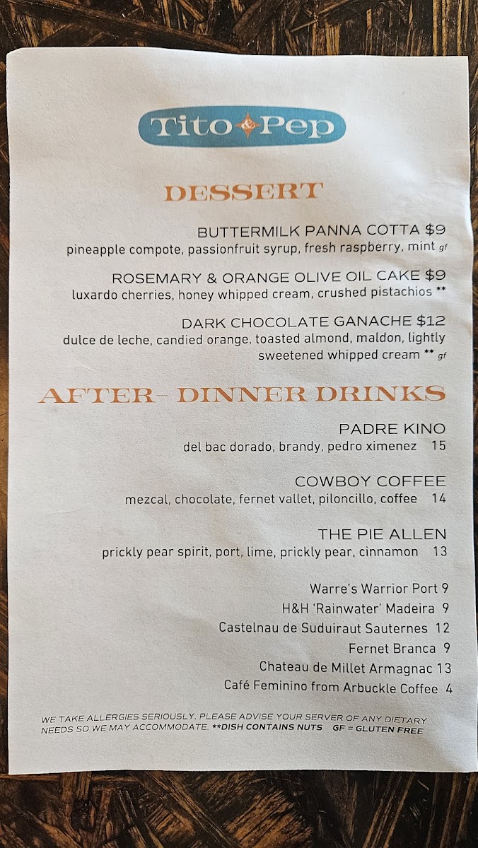 The menu at Tito and Pep offers a diverse selection of dishes organized into several groups, suitable for various dining preferences including appetizers, main courses, and desserts. The menu features a range of food options including seafood, meats, and vegetable-based dishes, prepared with a focus on bold and distinct flavors.
