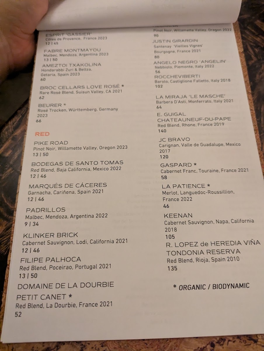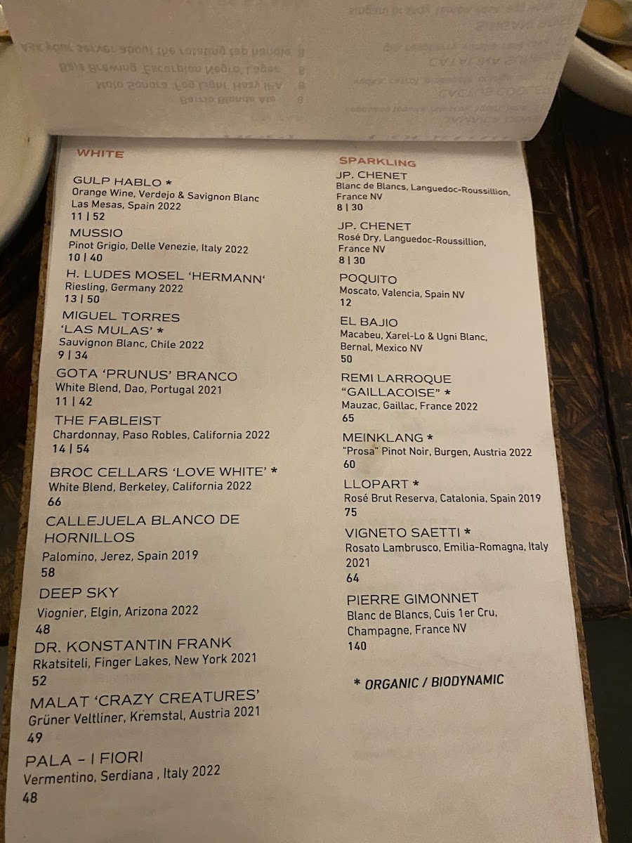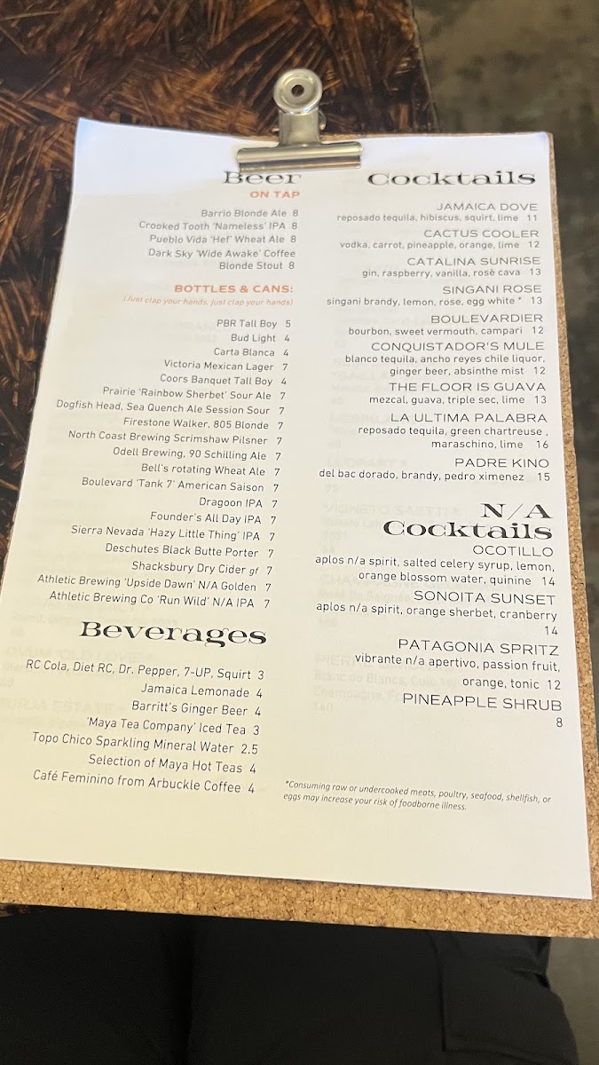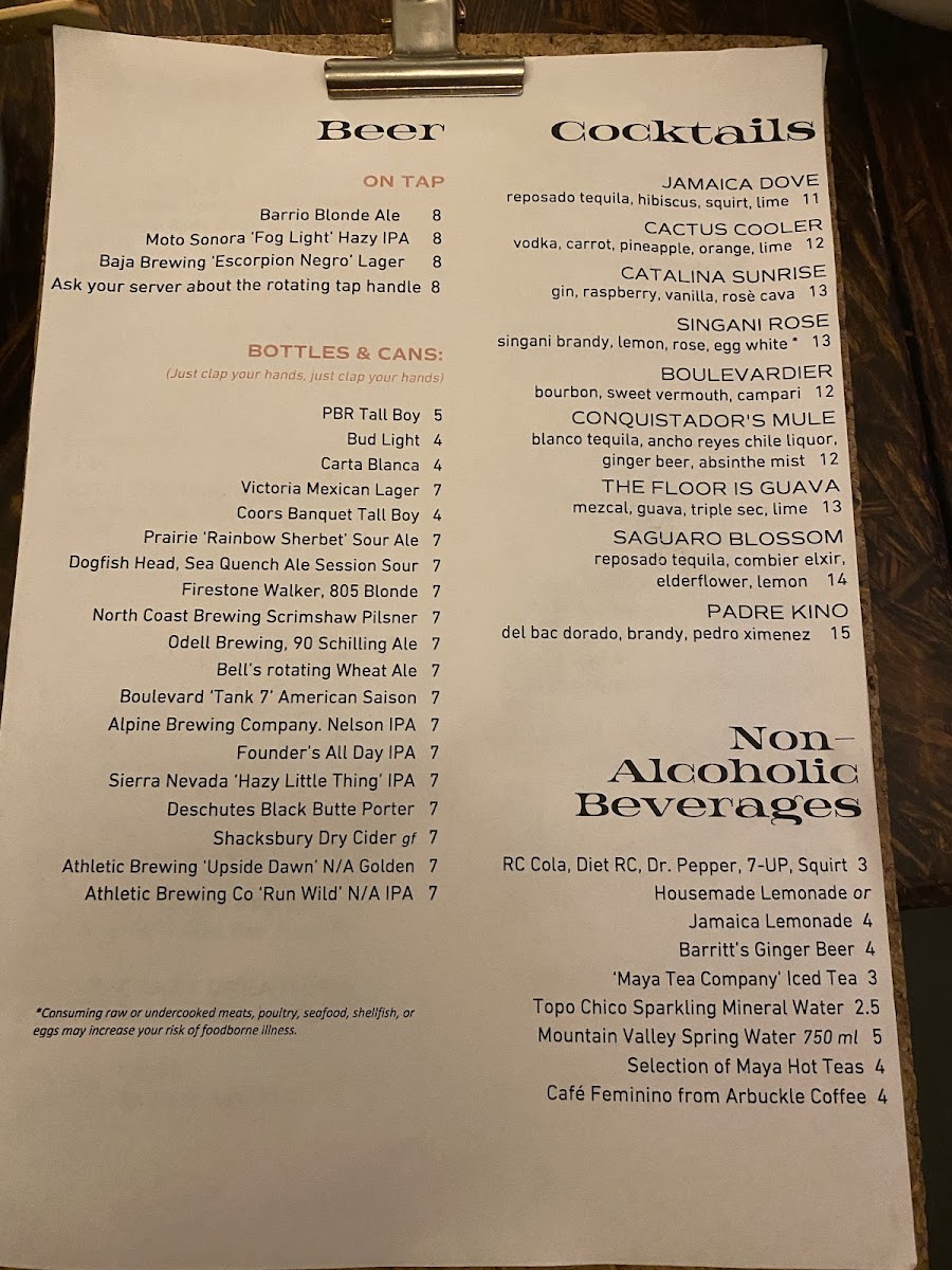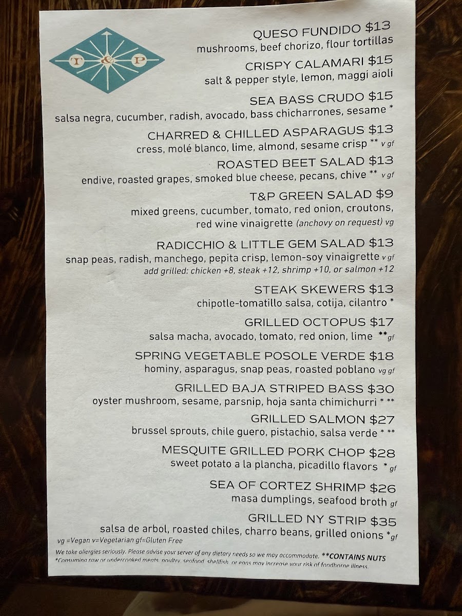 - Main Courses: Entrées include grilled items like mesquite grilled pork chop, flank steak, and steak skewers, as well as dishes featuring seafood such as grilled octopus, grilled trout, and masa battered shrimp. The menu also offers unique preparations like kampachi aguachile and charred & chilled broccoli.